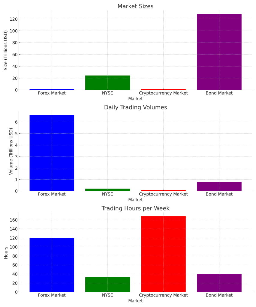 Forex stands out not only due to its size but also because of its liquidity and the opportunities it presents. The NYSE, though significant, appears small when compared to the forex market. Even the booming cryptocurrency market doesn’t come close to the sheer volume of the forex market.
